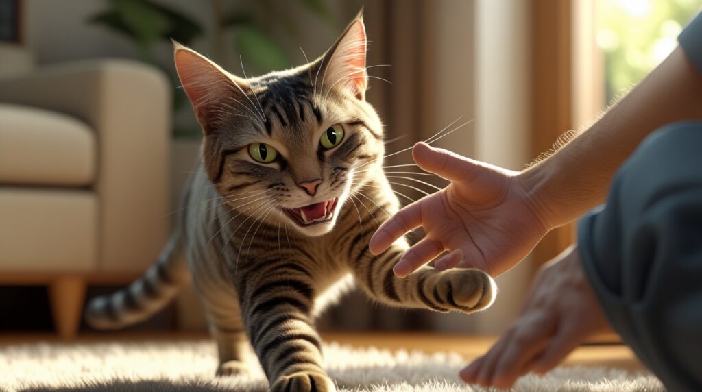 Stay calm and avoid reacting aggressively. Gently withdraw your hand, and give the cat space to calm down. Avoid punishment, as it can increase anxiety.
